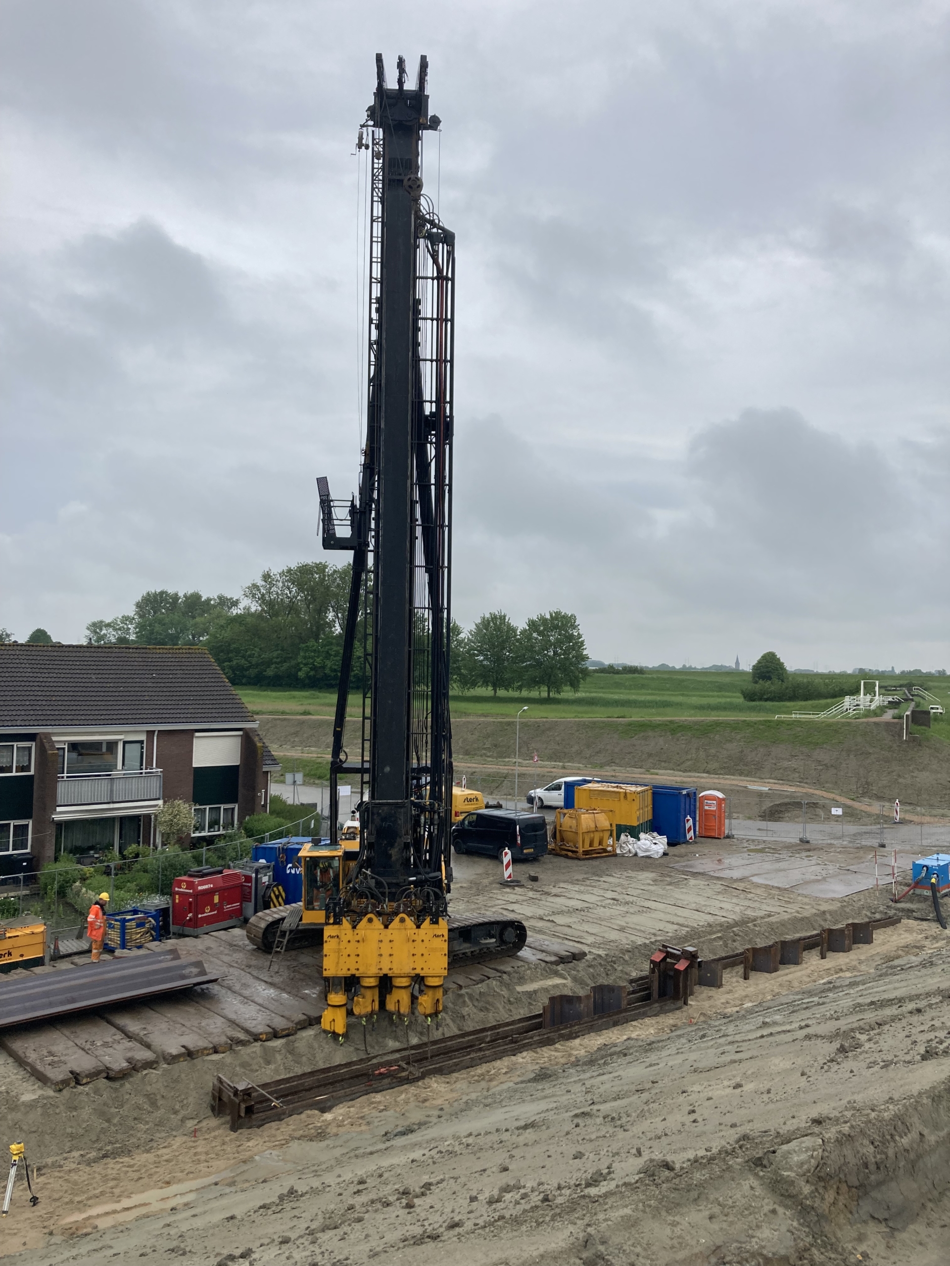 Omdat te weinig ruimte is voor een versterking met zand en klei plaatsen ze damwanden. Bij deze dijkversterking maken ze gebruik van twee verschillende technieken, namelijk trillen en drukken. De planken die tot nu toe zijn geplaatst gaan heel rustig naar beneden en veroorzaken tot nu toe weinig trillingen. Onze bemande meter, die de trillingsintensiteit continue in de gaten houdt, geeft aan dat er geen overschrijdingen van de grenswaarden zijn gemeten. Ze plaatsen de planken bij de Veerweg en bij de sportvelden. Ze drukken de planken rustig naar beneden en dit zorgt voor weinig trillingen.
